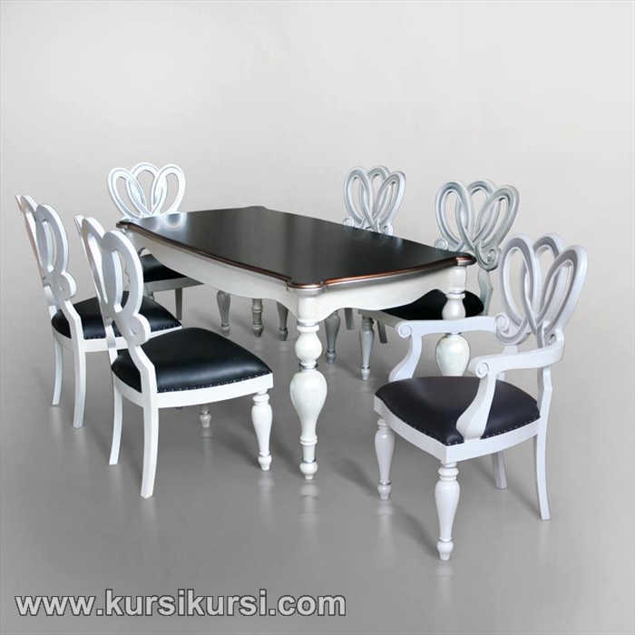 Jual Set Kursi Makan Sandaran Kupu Kupu memiliki desain yang sanagt bagus dan desainnya juga beda dengan produk lain , Jual Set Kursi Makan Sandaran Kupu Kupu memiliki sandaran yang unik yang memiliki bentuk seperti kupu kupu , dan memiliki warna putih di kayu nya , dan memiliki sofa empuk berwarna hitam dan atas meja warna hitam Jual Set Kursi Makan Sandaran Kupu Kupu .